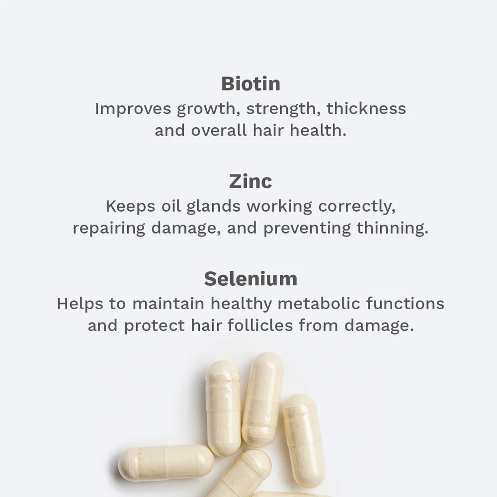 ترکیبات کلیدی: بیوتین، زینک، سلنیوم، ویتامینهای گروه B (B6، B12، اسید فولیک)، ویتامین D، MSM، کلاژن هیدرولیزشده